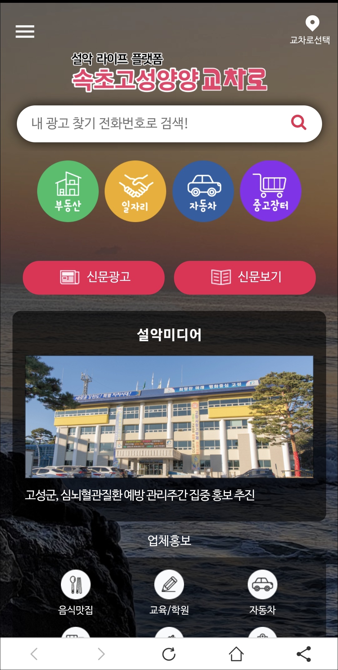 속초가 포함된 강원권을 클릭 하면 6개의 지역 교차로 신문이 분류되어 있는 것을 볼 수 있습니다. 속초교차로를 선택하면 위 오른쪽 화면처럼 속초,고성,양양 교차로 사이트로 접속이 됩니다.