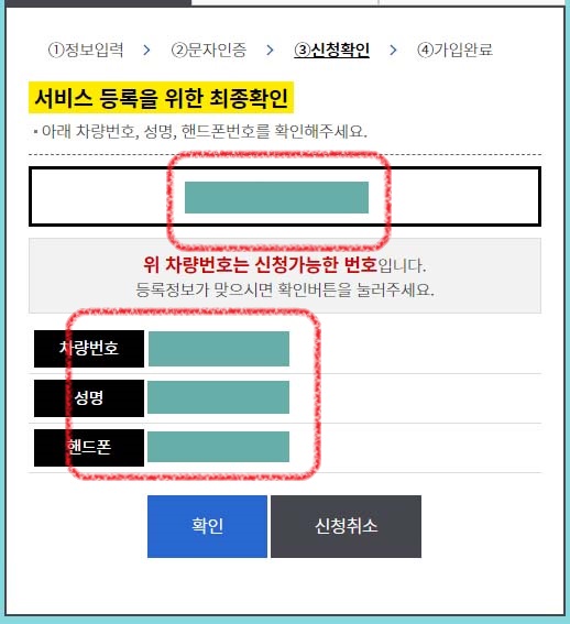 인증번호를 입력하고나면 신청 가능 여부와 함께 신청내용을 최종적으로 확인합니다. 내용이 맞는지 확인하고 확인 버튼을 클릭합니다.