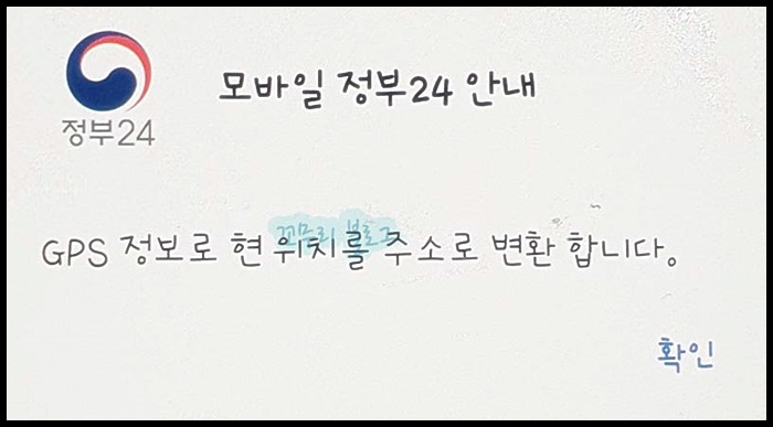 GPS(위치)를 체크하고 주민등록상 주소지와 50m의 오차범위 내에 있는 것으로 확인이 되면 되는데, 오차범위가 초과되면 위처럼 오류화면이 나옵니다.