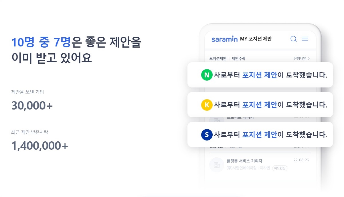 또한 사람인에서는 채용정보, 인재정보 뿐만 아니라 AI매칭 서비스를 통해서 기업으로부터 새로운 기회를 제안 받을 수 있고, 연봉정보나 면접후기, 멘토링매치, 취업TOOL 등을 통해서 자신 에게 맞는 정보와 방법을 찾을 수 있습니다.