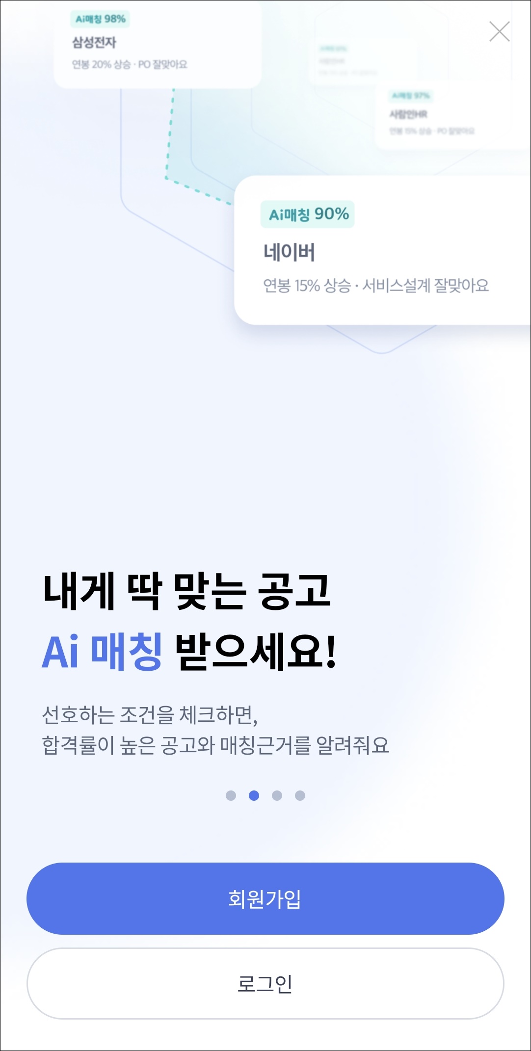 사람인 앱 설치 후 첫 화면 입니다. 직무적합도 무료 확인 가능, AI 매칭 공고 확인, 지원전 포지션 제안 확인, 이직 성공 축하금 관련 네 가지의 서비스를 간단하게 알려주고 있습니다.