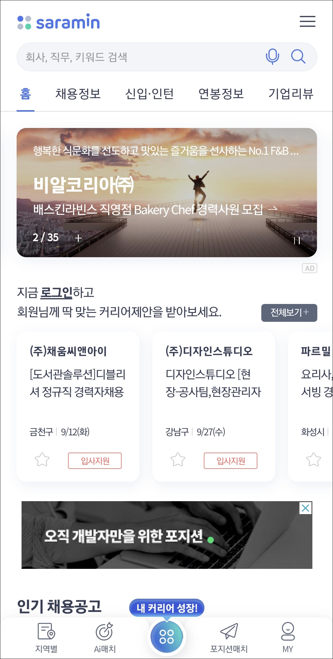회사,직무,키워드 검색으로 정보를 확인할 수 있으며, pc 컴퓨터 에서와 같이 채용정보 카테고리를 이용해서 지역별, 직업별, AI매치, HOT100 등을 통해서 자신에게 딱 맞는 채용정보를 확인하고 입사지원을 할 수 있습니다.