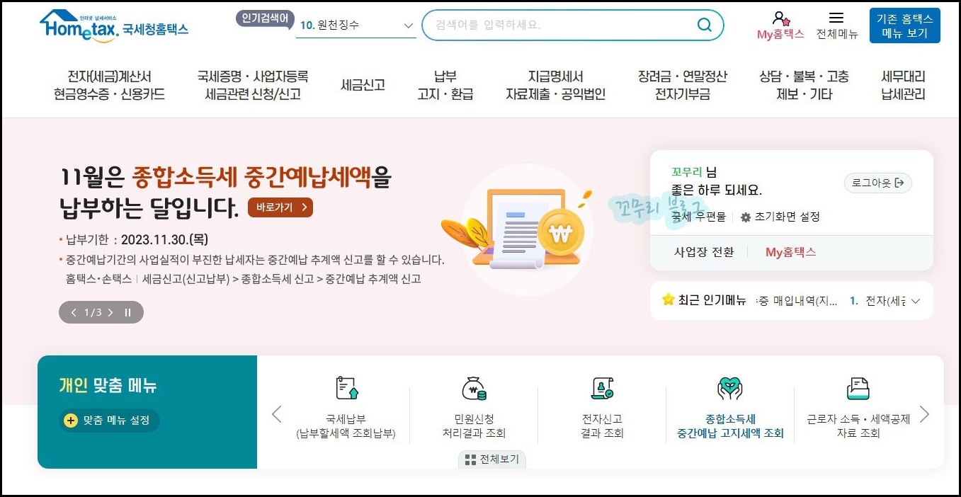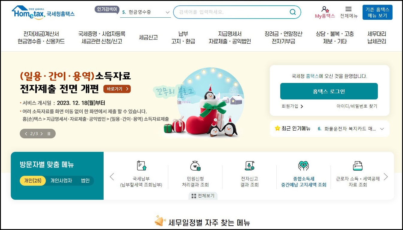 홈택스 메인화면 상단에는 여러 가지 메뉴가 있습니다.