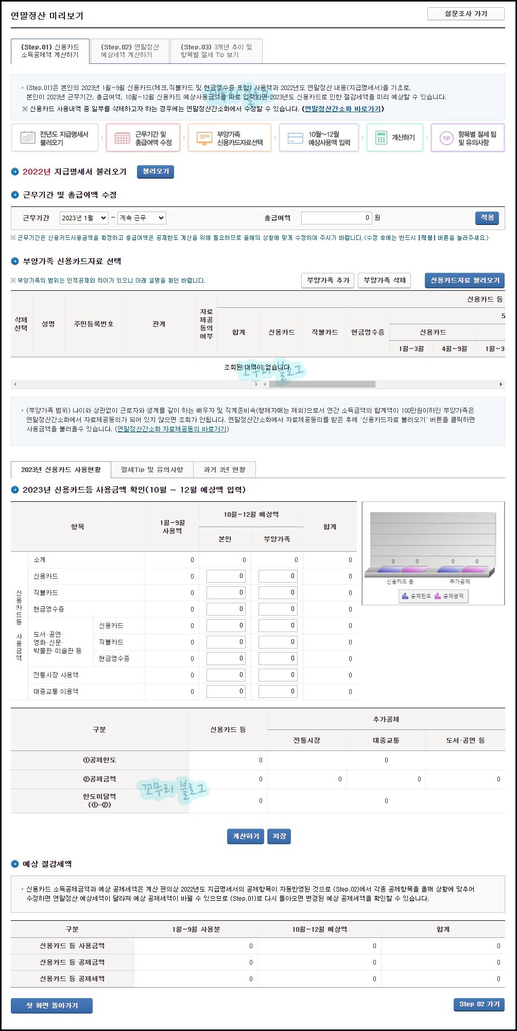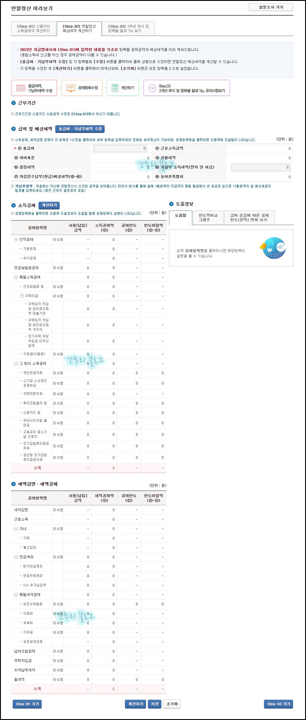 클릭해서 이동된 화면에서 알 수 있듯이 연말정산 미리보기 화면입니다. 왼쪽에 있는 Step.1을 클릭합니다.