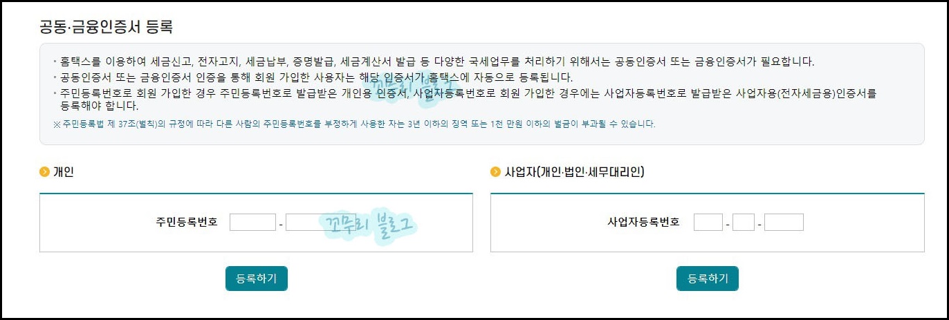 인증서 등록은 개인과 사업자로 나뉘어서 등록이 가능한데요, 본인에 맞춰서 선택하여 주민등록번호나 사업자등록번호를 입력하고 등록하기 버튼을 클릭합니다. 인증서를 선택하고 비밀번호를 다시 한번 입력합니다.