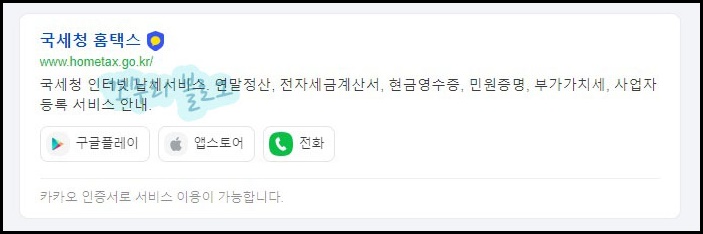 검색을 하면 위와 같이 국세청 홈택스 사이트가 나오며 클릭하여 이동을 합니다.