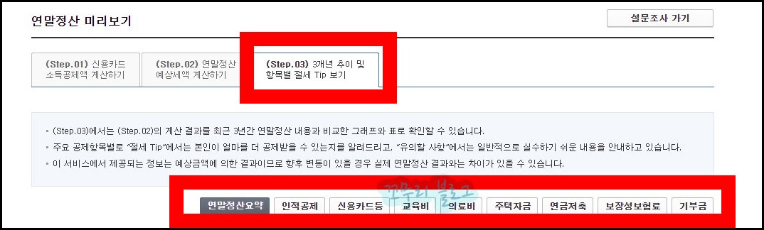 마지막 Step3 화면으로 넘어가면 최근 3개년 추이 및 항목별 절세 팁을 볼 수 있습니다.