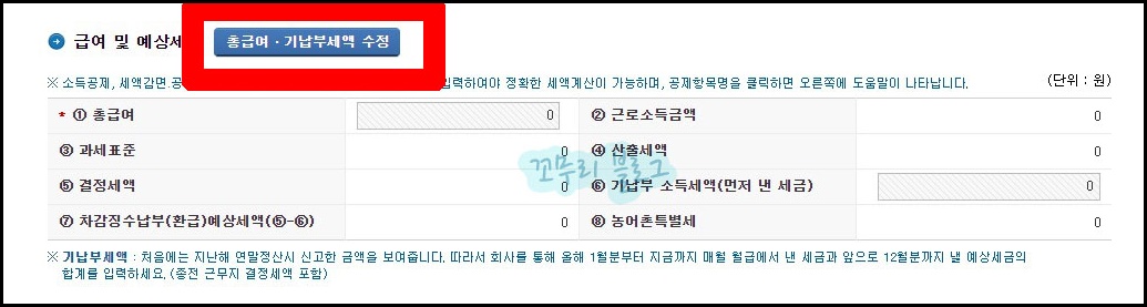 상단에 있는 급여 및 예상세액 > 총급여, 기납부세액 수정 버튼을 클릭합니다.