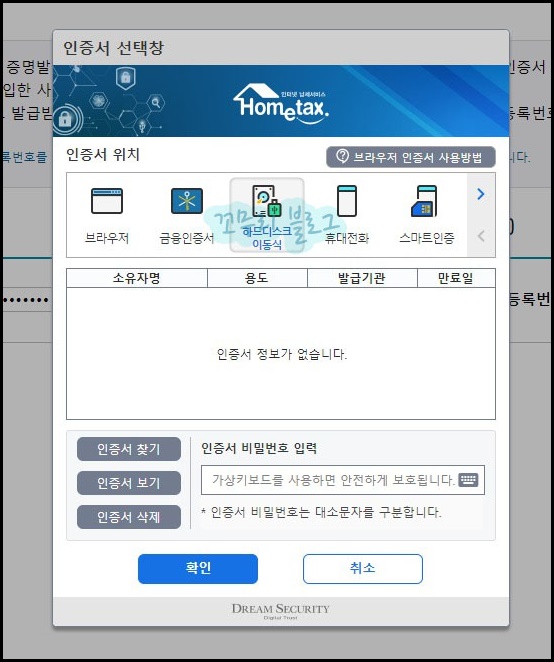 확인을 클릭하니 공동.금융인증서 등록화면으로 이동이 됩니다. 홈택스를 이용하려면 공인인증서가 등록이 되어 있어야 합니다.