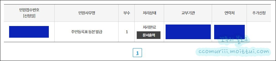 주민등록등본 인터넷발급 받았다면 민원 신청내역에서 위와같이 주민등록표 등본발급 처리완료 상태로 나와있을 겁니다. 인쇄 하는 방법과 동일하게 문서출력을 클릭합니다.