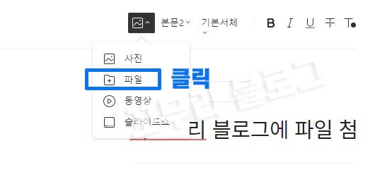 우리는 이미지를 넣을 것이 아니라 파일 첨부 하는 방법을 궁금했던 거니까, 아래와 같이 두 번째에 있는 파일을 클릭하시면 됩니다.